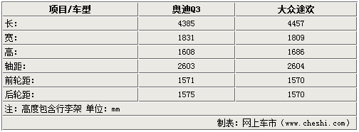 全新奥迪Q3与进口大众Tiguan共享大众集团先进的PQ35平台,2.6米的轴距只能算是一款A级的SUV车型,与大众进口Tiguan相比在轴距方面仅长了1毫米,而在长宽高方面两款车型则没有太大的差别。