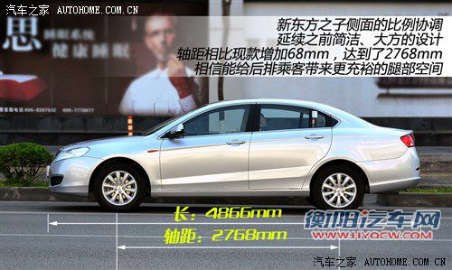 车身尺寸方面,新东方之子长宽高分别为:4866mm/1840mm/1500mm,比老款车型长了96mm,宽了25mm,高了55mm。新东方之子的轴距为2768mm,保证了较为充足的后排空间,提高了舒适性。