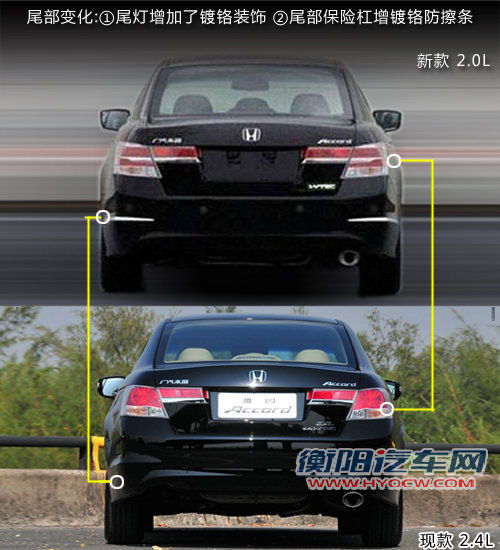 在外观上新款雅阁增加了诸多的镀铬装饰条,中网造型恢复了老款的紧凑的镀铬中网,相比现款镀铬范围进一步增大。保险杠处及车身侧面均增加了镀铬防擦条,增加了美观性的同时也增加了防护作用。轮毂方面,实拍车型为2.0升车型相比现款同排量车型的轮毂造型也有细微变动。而在尾部造型上尾灯上的镀铬装饰条进行了延伸,进一步加大了镀铬范围,尾部保险杠也增加了两处镀铬装饰条,诸多装饰条的应用将是新款雅阁的外观造型更显大气庄重。