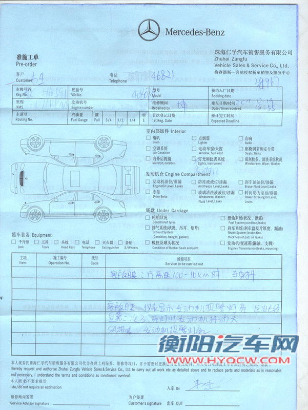 (2012-1-4 13:06)珠海仁孚4S客服:苏先生,您好,不好意思刚才打搅您了,我是珠海仁孚奔驰的小梁,现在跟您汇报一下您车的情况,您车的技术报告已回复,确认是发动机电脑内部有故障,需要更换发动机电脑,属于保修范围内的,需要您确认后订货回来更换,谢谢!