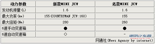 对于动力的升级显然是JCW版本的发展核心,我们从上表不难看出,新款MINI JCW搭载的1.6T发动机在动力上更加强劲,COUNTRYMAN JCW搭载的1.6T版本最大功率为160千瓦,而其余的版本则为155千瓦。新款1.6T引擎由于采用了双涡轮增压技术和缸内直喷技术,并且在材质和活塞等部分均进行了优化,在峰值扭矩上可以达到282牛米,较老款提升了20牛米。值得一提的是新JCW还将可选自动变速器,这对于进入中国市场绝对是一大利好。