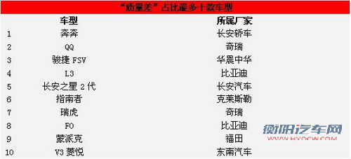 2.46%被评价为“质量差”的车辆中,所占比例最高的十款车型分别为长安奔奔、奇瑞QQ、骏捷FSV、比亚迪L3、长安之星2代、指南者、瑞虎、比亚迪F0、蒙派克、V3菱悦。