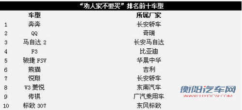 6.8%的会“劝人家不要买”的车型中,占比最多的是自主品牌,其次有个别日系车、法系车和美系车。反推荐排名前十的车型为长安奔奔、奇瑞QQ、马自达2、比亚迪F3、骏捷FSV、吉利熊猫、长安悦翔、V3菱悦、传祺、标致307。东风标致307之所以上榜,是因为车主们普遍反映,小毛病多,且底盘不扎实,有的车主甚至称,“过坑坑洼洼路面甚怕车子坏掉”。