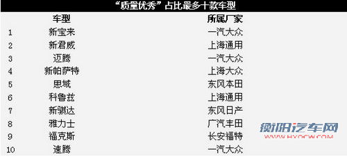 质量得分较高的车型主要集中在德系、美系和日系车。其中,在这15.92%被评为“质量优秀”的车型中,占比最多的十款车型分别是新宝来、新君威、迈腾、新帕萨特、思域、科鲁兹、新骐达、雅力士、福克斯、速腾