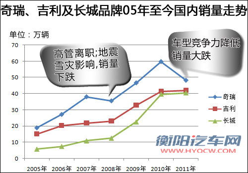 2008年奇瑞经历了剧烈的人事震荡,以李峰为首的销售团队高管离开,以及受年初雪灾等自然灾害对产品供应的影响,使之奇瑞销量下跌,国内的销量排名也下滑到第5位。随着政府推出限号政策以及汽车下乡补贴政策取消等不利因素的介入,再加之先前产品研发团队高管的陆续离职,导致产品体系的动荡、与其他品牌相比车型竞争力较低,各种不利因素的汇聚,使其2011年销量同比出现大幅下滑。