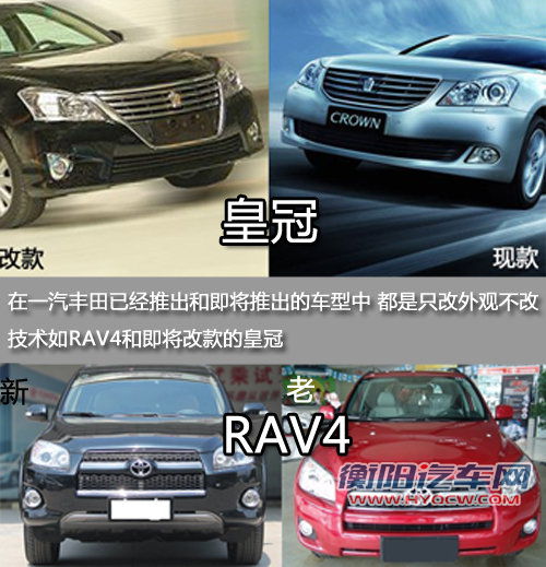 在一汽丰田已经推出和即将推出的车型中,都是只改外观不改技术。例如应经经过改款的丰田RAV4 和即将改款的皇冠车型都只是在外观上做了小手术,技术上依然沿用先款车型,因这已经成为丰田旗下车型改款的一个惯例,而花冠的该款车型也将会遵从这个规律。