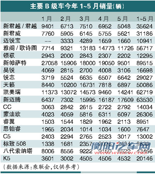 在豪华车(C级车以上)占据绝对统治地位后,德系车向B级日系车三强雅阁、天籁、凯美瑞发起猛攻,从销量上来看,德系“双杰”新帕萨特、迈腾已经赶超日系,成为B级车市场新的领导者。在25万元以上的高端B级车市场,别克君越占据了七成份额,并通过君威的“双君”组合对日系车形成下压之势。韩系品牌第八代索纳塔、K5也来势汹汹,凭借着较高的性价比显示出咄咄逼人的态势。还有东风标致508、东风雪铁龙C5等,也均各具特色,与其他品牌一起“分食”着原本被日系车掌控的B级车市场份额。