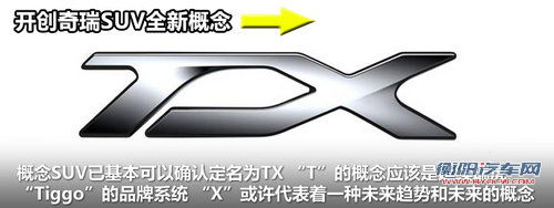 曾经的概念SUV---TX代表着未来奇瑞SUV车型的全新设计理念,“T”的概念应该是延续瑞虎“Tiggo”的品牌系统,但“X”应该并不是一般意义上的产品序列符号,“X”或许代表着一种未来趋势或者产品起源的概念。