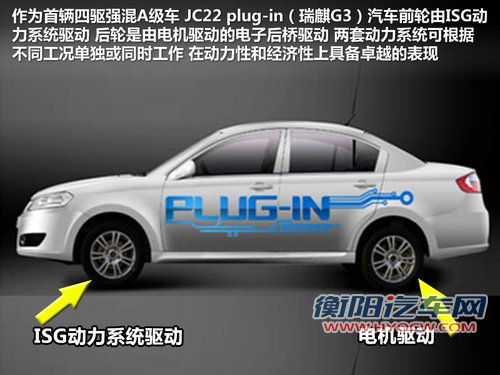 作为首辆四驱强混A级车,瑞麒G3汇聚多年研发经验,具备了高安全和高配置的特性,四驱强混混合动力汽车该车以瑞麒G3为平台,是奇瑞开发出的一款插入式混合动力汽车。汽车前轮由ISG动力系统驱动,后轮是由电机驱动的电子后桥驱动,两套动力系统可根据不同工况单独或同时工作,在动力性和经济性上具备卓越的表现。