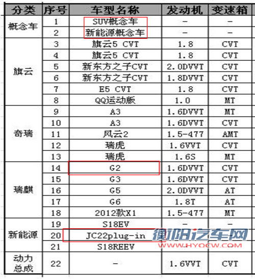 ◆部分车型曾经亮相于北京车展奇瑞参展阵容车型 此图为EXCEL截图◆