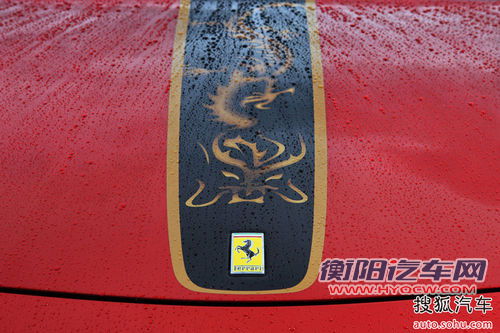 外观特殊样式:整个外观设计的点睛之笔是前机盖的金色腾龙与法拉利跃马标徽交相辉映,意蕴中国传统文化中奋斗不息的“龙马精神”,配以象征赛道的镶金黑色条纹给人带来强烈的视觉震撼力,尽显豪迈之感和王者风范。
