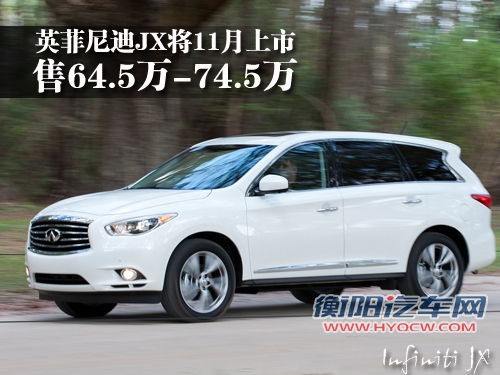 近日,网通社从英菲尼迪经销商处获悉,目前英菲尼迪全新SUV-JX已接受预定,该车将于11月上市,有两驱和四驱两种车型,其售价为64.5-74.5万。针对英菲尼迪JX是否在11月上市,英菲尼迪中国公共关系部高级经理葛然先生在接受网通社采访时表示:“英菲尼迪全新7座SUV-JX初定在11月份上市,其也有可能提前上市,同时英菲尼迪FX小改款车型将于下月上市。”