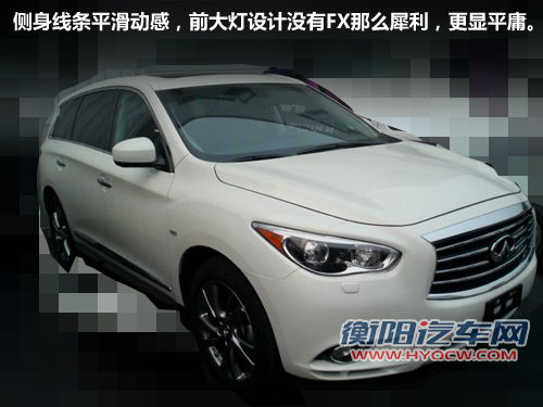 JX侧身线条平滑动感,前大灯的设计风格没有FX那么犀利,显得更加平庸。轮毂造型没有过多的花哨,采用与M系同样设计的双五幅轮毂造型,镀铬的侧防擦条也运动其中,整体看上去更加稳重大气。