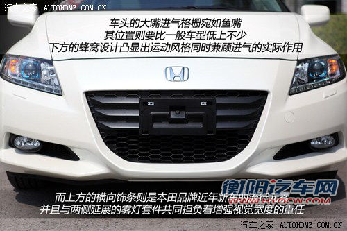外观内饰体现着运动和时尚。车头的大嘴进气格栅宛如鱼嘴,下方的蜂窝设计凸显出运动风格,头灯组采用弯刀式的设计充满着杀气,双门造型配上16英寸的双五幅轮毂,都在细节之处体现着运动的气息,整体造型更是趋向于“低、宽、扁、短”。CR-Z的内饰整体造型极富科技感,其中大尺寸的彩色立体仪表盘更是该车内饰设计上的点睛之笔。