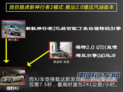 2012年新款神行者2搭配2.0T引擎上市销售改款引擎正是来自福特旗下的GTDi直喷增压引擎,据悉,2013款XJ采用的正是这款尺寸紧凑的全铝四缸2.0升I4涡轮增压汽油发动机,这台发动机的功率在转速为5500rpm时达到峰值240马力,转速为2000-4000rpm时扭矩为340牛·米。而目前捷豹XJ使用的3.0升自然吸气发动机最大功率为238马力与293牛·米,但每公里碳排放量高达249克,市区油耗高达15.9升/百公里,采用福特2.0GTDi直喷增压引擎后油耗表现和二氧化碳排放量都将得到有效降低。