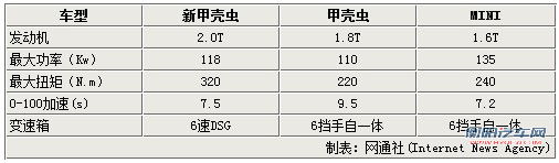 新甲壳虫首次搭载了2.0升涡轮增压发动机,这在之前的甲壳虫车型中是没有的。2.0T版本车型其发动机最大功率达到118千瓦,最大扭矩达到了320牛.米,0-100加速为7.5秒。此外,变速器采用了6速双离合,将使驾驶过程更加流畅。从上表中不难看出,新款2.0T版本车型表现强于现款1.8T车型,并且不输于MINI,在最大扭矩方面更是超越MINI,充分的显示出新款甲壳虫在动力方面的提升。网通社不久前曾就新款甲壳虫引入车型问题与大众中国内部人士沟通,对方表示2.0T版本将不会引入国内,只有1.2T和1.4T会引入。