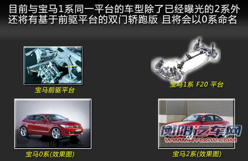 在宝马1系的平台的基础上开发出了2系车型,未来还有一款前驱平台的0系车型来填补宝马现有产品的空白,由于低于1系的定位,该车将于奥迪A1和奔驰A级相竞争,除了依然使用轿跑风格的外观,0系将不在为宝马的后轮驱动方式会以下代MINI相同的前驱平台打造。