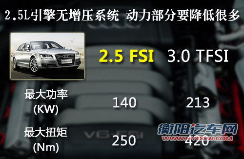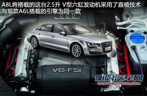 这款2.5升引擎采用V型六缸设计,采用了大众家族引以为傲的直喷技术。奥迪A6L搭载的2.5 FSI发动机最大功率为140千瓦,峰值扭矩为250牛米,虽然数据上无法与现款A8L的3.0 TFSI引擎相比,但对于A8L的入门级售价将是一个全新的突破。