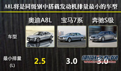 发动机排量的降低将直接影响到新车的售价,A8L搭载2.5升引擎后消费税税率降低了13%,参考竞品后预计售价将有望降低至75万元左右。而值得注意的是,在与宝马7系、奔驰S级的比较中奥迪将是排量最低的,这将是旗舰级豪华轿车市场中从未有过的水平。