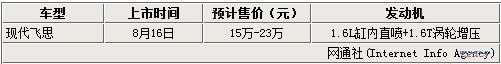 近日,网通社从进口现代多家4S店了解到:目前各个经销商都已对新款飞思接受预定,换代飞思将于8月16日上市,新款车型将搭载1.6L缸内直喷发动机与1.6T涡轮增压发动机取代现款的1.6L自然吸气发动机,在动力得到提升的同时,燃油经济性也进一步提升。其还表示:新车预计售价在15万-23万元。