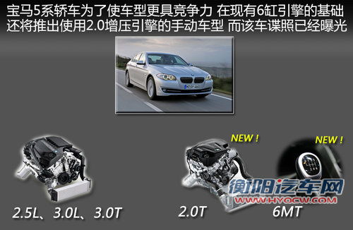 在宝马5系现有的车型中,最低为2.5L排量的车型。而在近日网络中也曝光出了5系手动车型的谍照以及环保目录,目录中提到宝马会有一款6挡手动车型将推出,在宝马现款的产品中,1系和3系都相应的推出了手动车型,而5系又作为宝马卖座的车型之一,推出2.0排量车型将更进一步降低消费税水平。