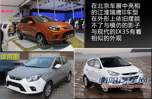 在4月23日的北京车中,江淮汽车首次亮相了SUV车型瑞鹰的换代产品。新车完全脱离了首代瑞鹰的外形设计,这种全新的设计亮相后让观众及媒体受到了更多的关注,但江淮汽车作为一家年轻的自主车企,在新车的外形设计中依然还可以找到模仿的影子,从上代瑞鹰模仿现代圣达菲后,新瑞鹰还将模仿现代的另一卖座车型IX35。