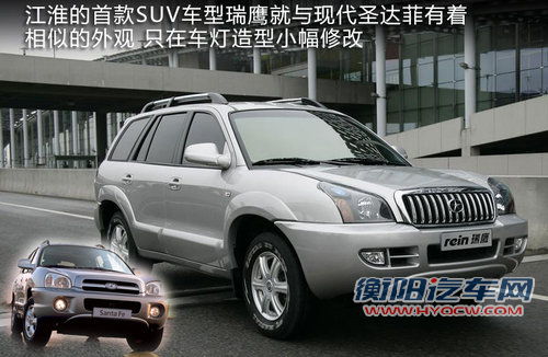 江淮汽车是以MPV为重点的汽车厂商,为使乘用车更加良好的发展,推出了首款SUV车型-瑞鹰,该车与现代的圣达菲有着相似的外观,而在大灯造型及进气格栅只是经过了细微调整。在当年发布后凭借其和现代圣达菲相似的外观及出色的性价比取得了不错的销量。