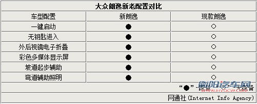 新款朗逸在配置方面实现完美越级,从目前所获得的信息中,一键启动、无钥匙进入和后视镜电子折叠均为首次出现在新车中,座椅加热更是现款朗逸高配车型才所具有的,而带有手动关闭功能的ESP也或将搭载到全系车型中,坡道辅助及弯道照明等中高级车型中出现的配置将会出现在新朗逸中。综合而言新朗逸所加载的配置以及预计12万起步的售价,新朗逸的性价比将更加出色。