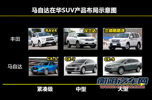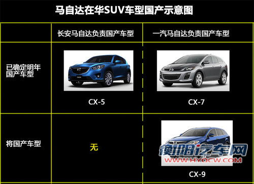未来马自达汽车在华将会拥有三款SUV车型,其中包括在国内先期以进口形式销售的CX-5和CX-7两款车型并且这两款车型在明年将会分别在长安马自达和一汽马自达进行国产,所以CX-9车型也极有可能会采用先期以进口形式在国内销售未来再实现国产的形式。
