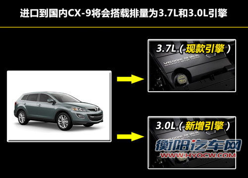 以进口形式引入国内的CX-9在动力系统方面将会继续延用现款搭载的3.7L引擎,而网通社在走访北京地区一汽马自达经销商时得知:以进口形式引进的CX-9车型还会增加一款搭载排量为3.0L V6引擎的车型,这样来看与同级别车型搭载排量动辄4.0L以上的车型相比,CX-9在入门级车型上的整车售价将会具有更强的市场竞争力。