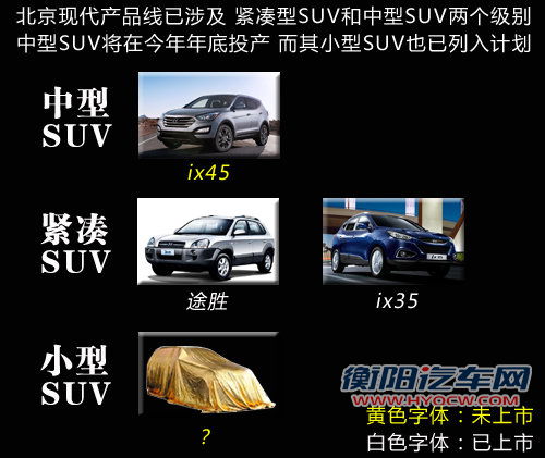 目前北京现代在SUV已投产了ix35、途胜两款紧凑型SUV,今年年底还将在第三工厂投产中型SUV-ix45(即进口全新一代胜达),为丰富其SUV产品线,并针对性的弥补细分市场的缺失,投产小型SUV也是必然的举措。