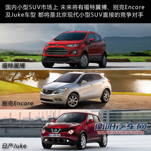 面对国内红火的SUV市场来说,小型SUV尚是一片未开发的领域,而对海外市场而言,已逐渐形成SUV小型化的趋势。再说国内市场,今年下半年上海通用别克将引入并国产旗下的小型SUV车型-Encore,4.3米的车长以及2555毫米的轴距使其在尺寸上与一款小型车相比并无差异。而长安福特以及东风日产也将国产翼搏和Juke车型,均有望在今年下半年引入。针对这样的细分市场,北京现代也将涉足这一领域,而翼搏、Encore以及Juke等车型也将成为北京现代A0级SUV最直接的竞争对手。