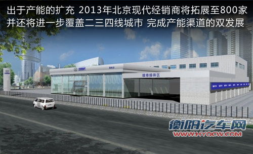 随着北京现代诸多新车以及拥有百万辆的整车产能,经销商渠道的拓展也是其必然举措。北京现代北区事业部部长李一秀在接受网通社采访时表示:2013年北京现代经销商将拓展至800家,其中包含卫星店在内。从现有数据来看,北京现代目前包括卫星店在内的销售网点数量超过600家。而800家的计划相当于有近20%的增长,以拓展三、四线城市的汽车市场。
