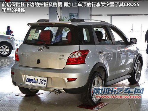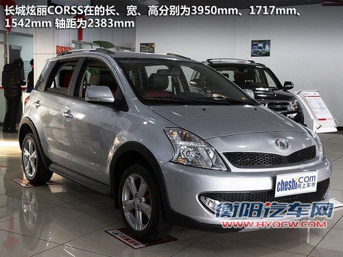 长城炫丽CORSS在的长、宽、高分别为3950mm、1717mm、1542mm,轴距为2383mm。造型方面运用了仿生学原理,两个类似小虎牙似的的雾灯是亮点。前后保险杠下边的护板及侧裙,再加上车顶的行李架突显了其CROSS车型的特性。