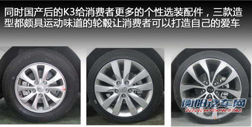 国产K3为消费者提供了更多的个性选装配件,三款颇具运动味道的个性轮毂让消费者可以打造自己的爱车,让爱车更具运动气息的同时,也与其他车辆与众不同,打造您的个性座驾。