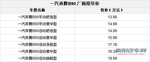 从上表格我们能够看到,一汽奔腾B90此次上市的全系共计七款车型。全系车型共分为两个排量,与老款相同,分别为2.0L排量与2.3L排量。从官方指导价最低的2.0L手动舒适型13.98万元,到最高配的2.3L自动旗舰型19.98万元区间。