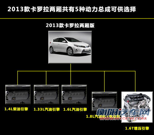 如上图所示,将在明年推出的2013款卡罗拉两厢车共有5种动力总成可供消费者选择,分别为一款排量为1.4L的柴油发动机、1.33L和1.6L的汽油发动机以及采用宝马提供的1.6T增压引擎,此外还将会有一套由1.8L汽油机+电动马达组成的混合动力系统。