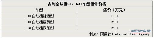 全球鹰GX7作为一款自主品牌SUV,在价格上应该说是很“亲民”,而针对将要上市的全球鹰GX7“升级版”6AT车型的价格,网通社近日以消费者身份电话询问了多家吉利全球鹰授权经销商,对方多表示价格在的区间会在11.39-12.99万之间。而对于这个价格区间,网通社与吉利汽车官方人士取得了联系,对方并未对此价格给予肯定,并表示车型价格以成都车展上市公布为准。