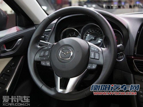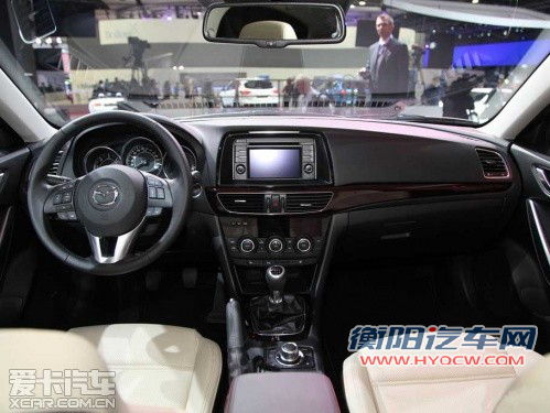 新马自达6采用了全新的内饰设计,带仿实木装饰件,中控采用5英寸液晶屏,仪表盘了采用蓝色背光的炮筒式造型,最右边的圆形仪表盘是一个3.5英寸的液晶屏,可以显示行驶信息。全新的多功能方向盘采用金属装饰件,更加凸显运动感。