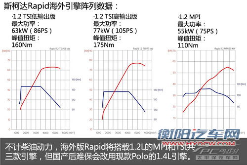 动力上,斯柯达Rapid共提供1.2L、1.2TSI、1.4TSI三款汽油发动机,其中1.2L发动机最大功率55kW(75PS),1.2TSI发动机有63kW(86PS)、77kW(105PS)两种版本,而1.4TSI发动机的最大功率达90kW(122PS)。