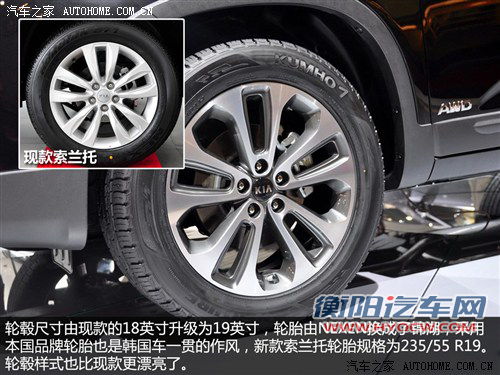 在车尾部分,后保险杠有与前雾灯相呼应的装饰型折射镜;新式尾门融入了家族风格的设计元素;后组合式尾灯不仅与现售车型有着明显的区别,而且在高配车型上还采用了LED组合式尾灯。在轮毂款式上,新索兰托采用了亮银式18英寸铝合金轮毂,轮胎尺寸依旧是全系235/60 R18。值得注意的是,海外版 索兰托采用的是19英寸轮毂,进口到国内的车型均采用18英寸 。