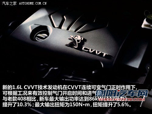 新款408搭载的2.0L发动机匹配了新的6速手自一体变速箱;另外1.6L车型换装全新1.6L CVVT技术发动机,相比老款车型,新1.6L车型的最大功率达到了117马力(86kW),扭矩为150N·m。据官方公布的数据,搭载新1.6L CVVT技术发动机手动版车型的油耗为7.0L,自动版车型油耗为7.4L,相比老款车型有明显提升。