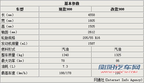 从曝光的参数来看,改款308在外形尺寸上没有任何变化,依然为长、宽、高分别为4558mm、1805mm、1505mm,轴距也没有发生变化,保持现款的2612mm轴距。此次改款车型莫过于发动机,改款车型采用了1.6升CVVT发动机,最大功率相比老款高出了8kw,在综合油耗上改款车型较现款车型有所减少,同时改款标致308的2.0L车型有望采用6速手自一体变速器,增强其在市场中的竞争力。