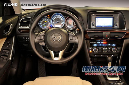 内饰上,新一代马自达6整体内饰风格与国内的马自达6睿翼相类似,不过经过重新设计的中控台显得更为立体,桃木和皮质材料的搭配使得新车档次提升了不少。同时,手动版短小精悍的挡把设计更会燃起运动爱好者的驾驶欲望,同时挡把后方类似宝马iDrive的控制按钮,也进一步体现出新一代马自达6的运动天性。