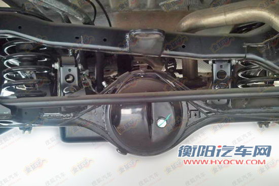 测试车的后悬,我们能够看到其采用的仍然是非承载式车身设计,后悬架采用的是整体桥非独立悬挂。另外,车辆还搭载了四驱系统。