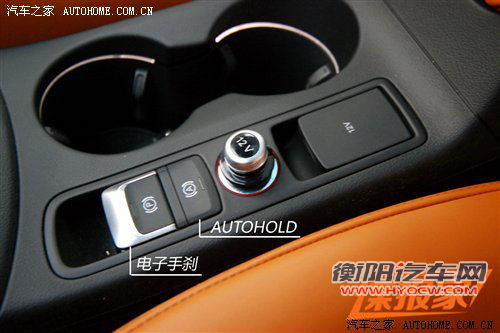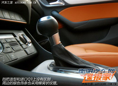 再往下,挡把的造型也和进口车型没有任何区别,周围的饰条与中控台一致,采用蜂窝状纹理效果,质感上和进口版Q3 35TFSI舒适型上的完全一致。再往下看则是杯架、电子手刹、AUTOHOLD和两个12V电源接口,毫无疑问,没差异。