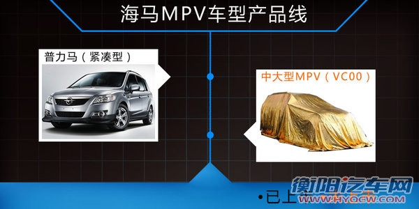 海马未来规划中,轿车产品将覆盖A0、A、A+以及B级市场,SUV产品覆盖紧凑型、中型、中大型市场,MPV将覆盖家用、商务市场。其目前仅有一款紧凑型MPV车型——普力马,在中大型MPV(VC00)推出后,将使产品线扩充至两款。此外普力马也将在2015年推出换代车型,未来其将进一步丰富MPV产品线。