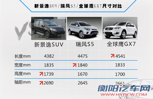 在车身尺寸方面,全新景逸SUV在高度与轴距方面均超过了瑞风S5/全球鹰GX7,长度则与瑞风S5/全球鹰GX7分别相差93mm和159mm,宽度小于瑞风S5 5mm,比全球鹰GX7多出2mm,由此可见新车与竞争对手相比优势较为明显。