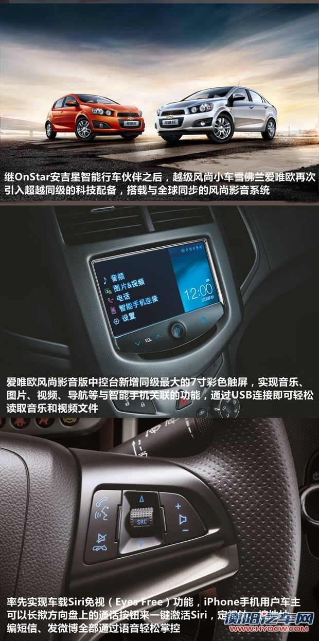 车内一键直连苹果手机Siri?——定闹钟、搜地址、编短信、发微博?USB连接7寸车载触摸彩屏,照片视频随意欣赏?没错,年轻人玩车又添新花样!继OnStar安吉星智能行车伙伴之后,越级风尚小车雪佛兰爱唯欧再次引入超越同级的科技配备,推出4款“风尚影音版”车型,搭载与全球同步的全新风尚影音系统,在原顶配车型上,中控台增设同级车型中最大的7寸触摸彩屏,分辨率为800X480dpi,实现音乐、图片、视频、导航等与智能手机关联的各项功能,为小型车的年轻购车族群带来越级的智能娱乐互动体验,指导价则在原车型基础上增加3000元。目前全系售价区间为81800万~114800万元。