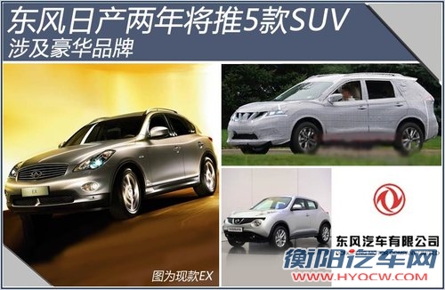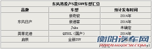 在东风未来两年有望投产的5款车型中,包括了东风日产的两款SUV全新奇骏和全新逍客,以及小型SUV车型Juke。英菲尼迪将在2014年国产的QX50L(原EX车型),而合资自主品牌启辰也即将推出的一款SUV。